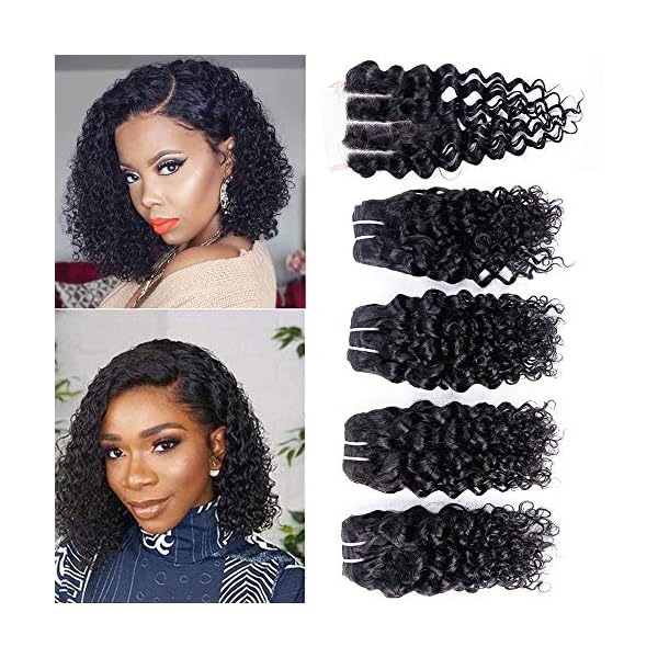 FQ Brazilian Water Wave Human Hair Bundles with Closure (10 10 10 10+ 8) Short Bob Curly Hair Bundles 10A Unprocessed Virgin Human Hair 50g/bundle Brazilian Water Wave Hair Bundles Natural Color