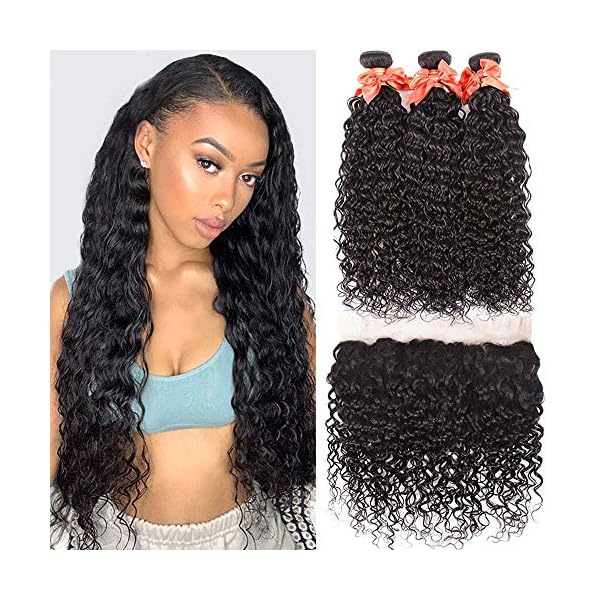 Water Wave Bundles with Virgin Wet and Wavy Bundles, Brazilian Curly Weave – 13×4 Lace Frontal, Human Hair, Natural Color (16, 18, 20+14)