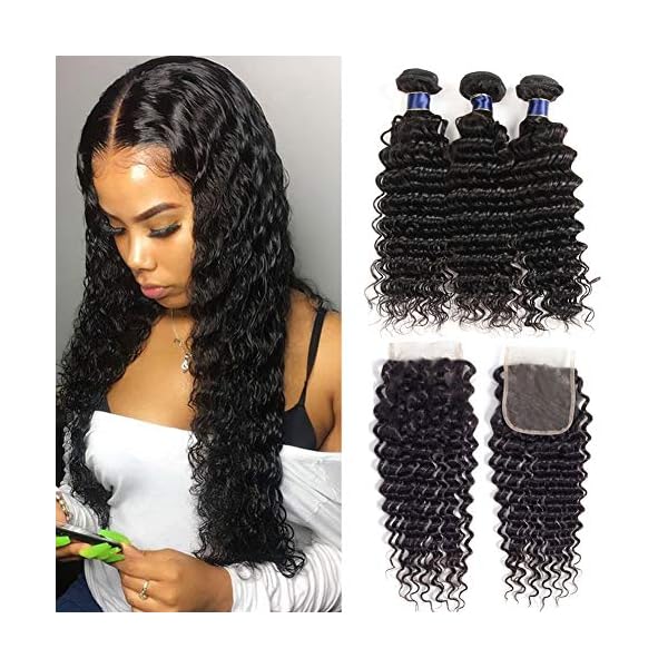 Healthair Brazilian Deep Wave Bundles with Closure Upgrade 8A+ Human Hair Bundles with Closure 100% Unprocessed Virgin Brazilian Curly Hair Bundles with Closure (12 14 16+10, Bundles with Closure)