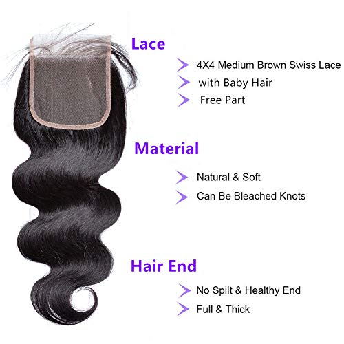 Lace Closure:4″X4″ Body Wave Lace Closure, 35g-50g/pc, Free Part,Medium Brown Swiss Lace,No Bleached Knots, 130% Full Density Swiss Lace Closure with Baby Hair.