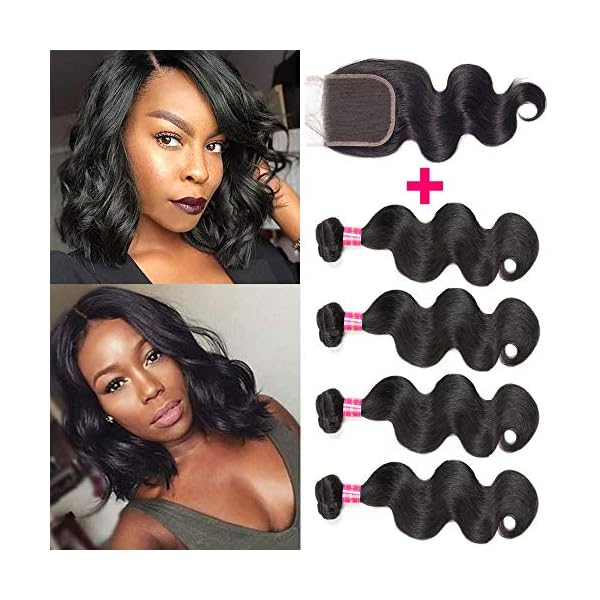 Brazilian Body Wave Bundles with Closure 100% Unprocessed Human Hair Bundles with Closure 8A+ Upgrade Short Bob Hair Bundles with Closure Free Part, 10/10/10/10+8 Inch
